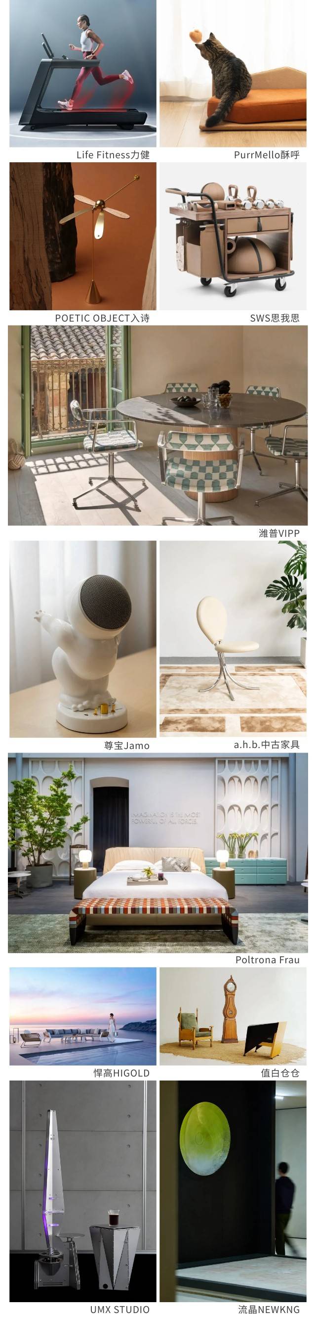 在融合休闲、健身、宠物与社交等多重场景的现代家居空间中,享誉全球的丹麦音响品牌尊宝Jamo、丹麦设计品牌潍普VIPP、意大利前沿家具品牌Poltrona Frau、专注于海淘进口中古与古董家具的值白仓仓、由艺术家赵子晗创立的功能性艺术品品牌UNICOGGETTO、知名设计师唐忠汉创立的设计品牌t.work、原创人宠家居品牌PurrMello酥呼、融合东西方美学悍高HIGOLD、专业家居饰品牌流晶NEWKNG、打造未来家居多元生活方式的UMX STUDIO、从中国文化土壤里生长出来的物件POETIC OBJECT入诗等将以个性化的审美为家注入灵魂与质感。Life Fitness力健将带来私人尊享定制版SYMBIO系列产品,奢华纯手工木质健身品牌器材Simon wood studio思我思将带来小工具推车套装,于细节之处培养健身习惯。综合性当代艺术展示与活动平台Hi艺术hiart space将携陈可、杜春风等10位艺术家的作品呈现“过去未来时——新雕塑系列展”。