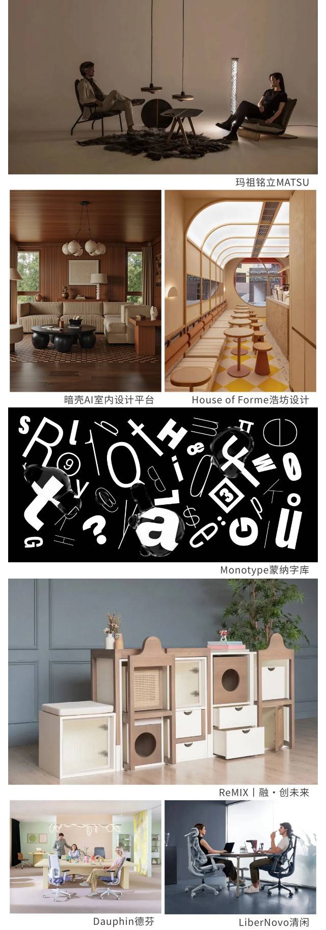依托深圳强大的设计力量及供应链基础,众多爆款项目背后的设计团队将走到台前,分享他们的设计思维与创作逻辑。打造Ulike、Usmile、猿辅导等诸多现象级爆款的佳简几何、以全案设计为品牌及空间注入生命的House of Forme浩坊设计、由香港工业设计师协会主办的ReMIX丨融·创未来都将展现设计与产业深度融合的创新力量。空间设计公司矩阵纵横携旗下暗壳AI室内设计平台、字体设计和技术领域的佼佼者Monotype蒙纳字库将为设计师们提供更好的服务与灵感。欧洲领先的办公座椅制造商之一Dauphin德芬、打造动态人机工学椅Omni的LiberNovo清闲、办公软装整体解决方案提供者玛祖铭立MATSU将携最新力作,提升办公的舒适性。