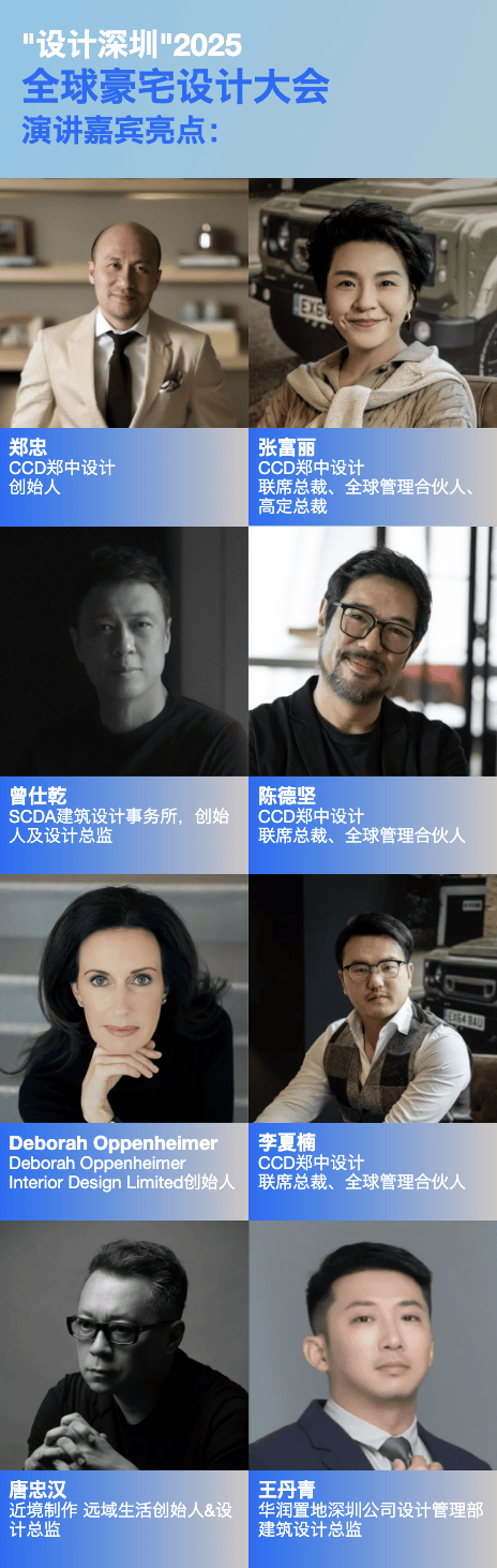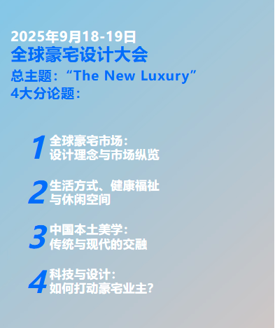 本届“设计深圳”2025 全球豪宅设计大会将携手国际领先设计事务所CCD共创主题“全球豪宅市场:设计理念与市场纵览”,从豪宅设计师们的视角出发,分析挖掘全球豪宅的区域差异和潜力,预测投资机会。